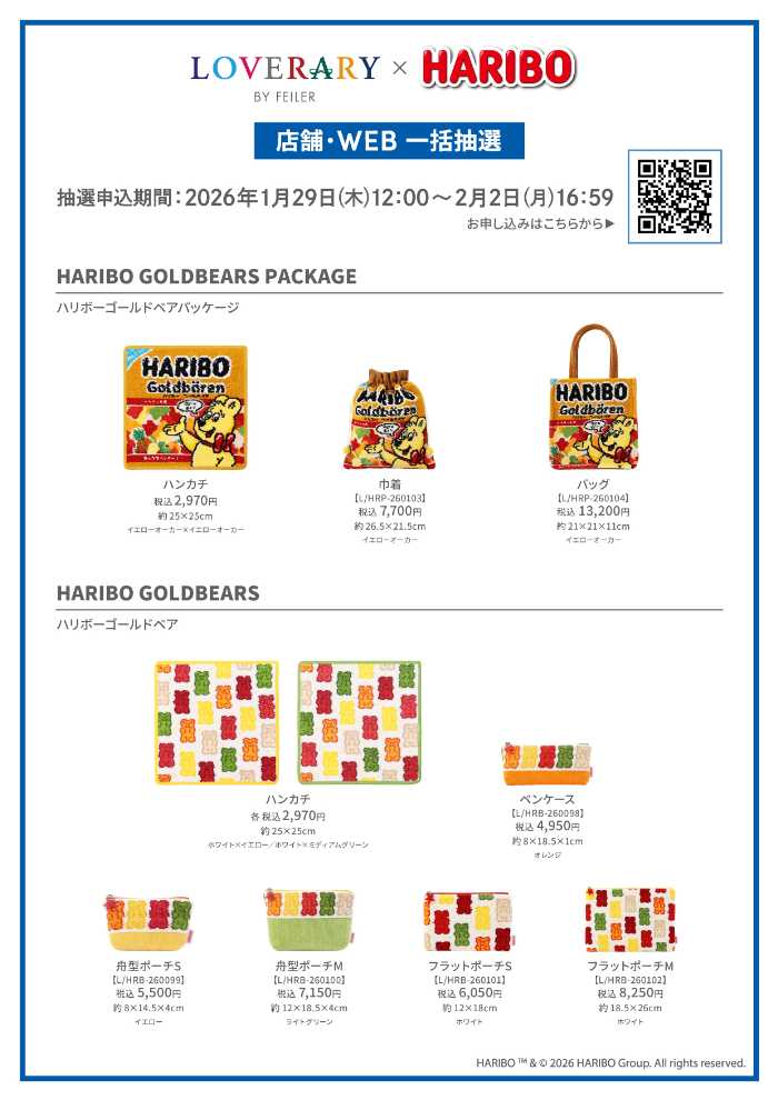 『ハリボーゴールドベア』はハンカチ2種類各2,970円(25×25cm)、ペンケース4,950円(8×18.5×1cm)、舟型ポーチS5,500円(8×14.5×4cm)、舟型ポーチM7,150円(12×18.5×4cm)、フラットポーチS6,050円(12×18cm)、フラットポーチM8,250円(18.5×26cm)。