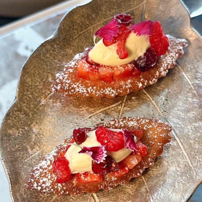 ちょこんと佇む姿が、なんとも愛らしい一品。自家製の干し柿とリコッタチーズを、サクサクの柑橘パイでサンド!仕上げに添えた甘酒のジュレが、深みのある自然な甘さをプラスし、至福の美味しさに。