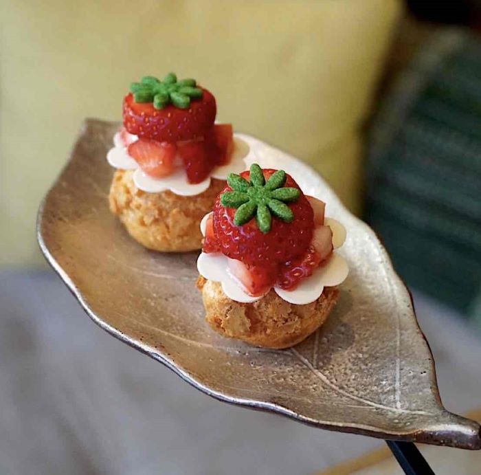 自然の造形美を感じるおしゃれなリーフ型のティースタンドには、契約農家から届く新鮮な冬野菜や、旬の苺の魅力を引き出したスイーツやセイボリーが並びます。