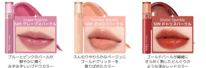 新登場の「グラスティングカラーグロススパークル」は、ゴールド・ピンク・ブルーなどの繊細なラメをバランスよく配合した【ちゅるりんラメ】仕上げ。