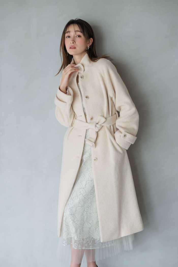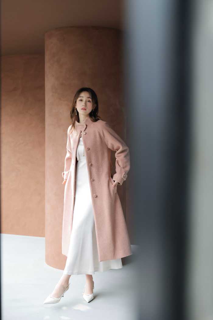 ドレススタイルを格上げしてくれるのが、【藤井サチコラボ】スタンドウールライクコート。価格は24,200円(税込)、サイズS,M、カラーはアイボリー、ピンク、ブルーの3色展開です。
