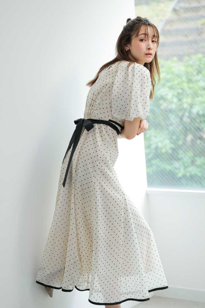 【藤井サチコラボ】バルーン袖ワンピースは、価格16,500円(税込)、サイズS,M、カラーはアイボリー、グレー。ドット柄と丸みのある袖が女性らしさを引き立てます。