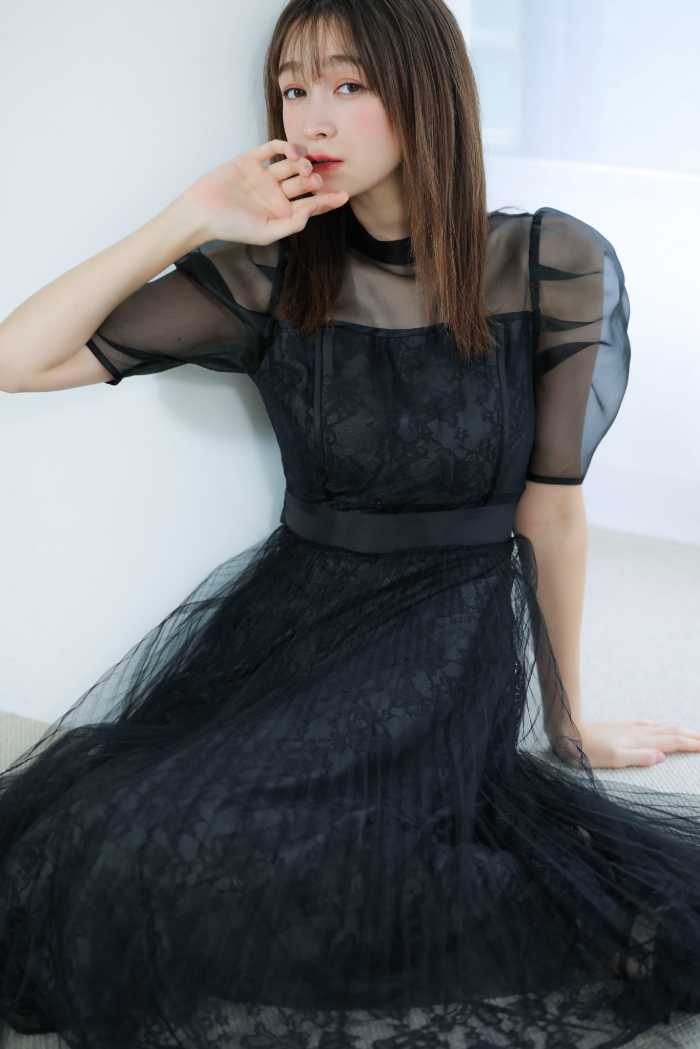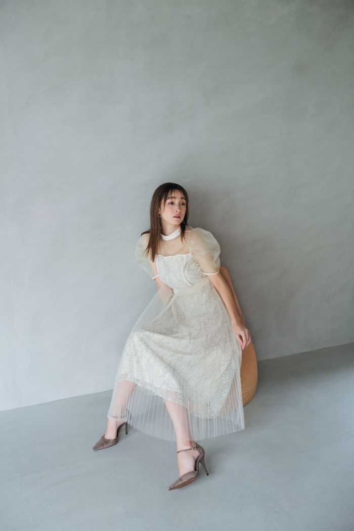【藤井サチコラボ】チュールレイヤードレースドレスは19,800円(税込)、サイズS,M、カラーはアイボリー、ブルー、ブラック。チュール×レースの重なりが特別感を演出します。