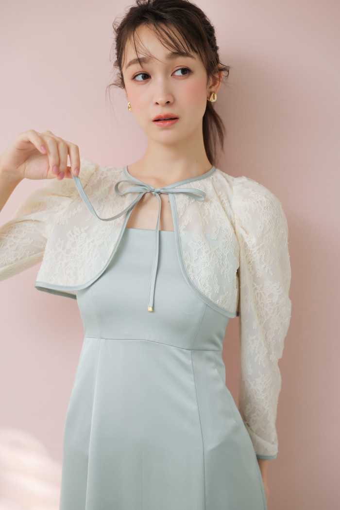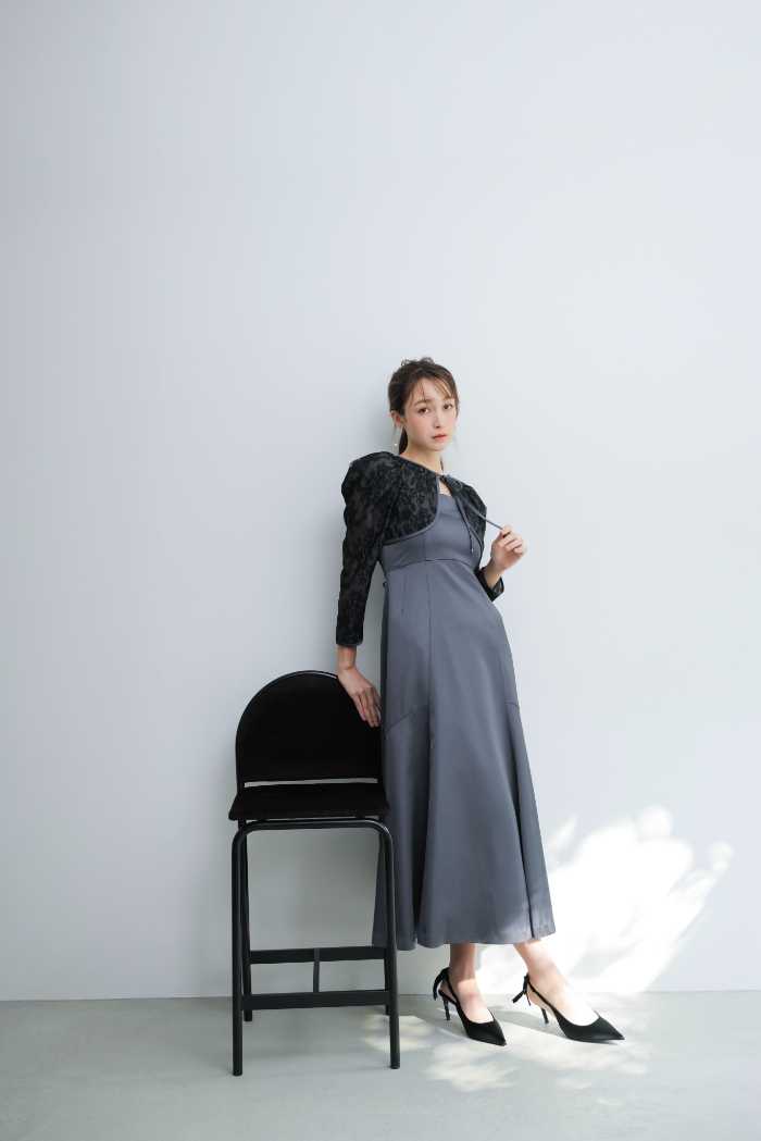 【藤井サチコラボ】ボレロSETサテンキャミドレスは19,800円(税込)、サイズS,M、カラーはアイボリー、グリーン、ブラック。揺れ感のあるサテンとボレロのセットで完成度の高い一着です。