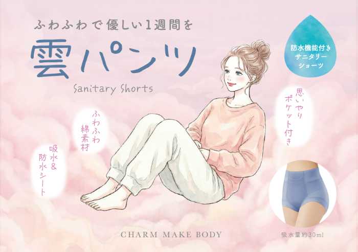 サニタリーショーツ選びがもっと快適に♡2026年4月8日(水)、人気ブランド「CHARM MAKE BODY」から吸水ショーツ「雲パンツ」が新発売されます。ふわっとした軽さと安心の吸水機能を両立した新感覚アイテムは、ゆらぎやすい日に寄り添うデイリーインナーです。敏感肌にも優しい綿素材や蒸れにくい設計など、こだわりの機能が詰まったサニタリーショーツで、心地よい毎日を迎えましょう♪