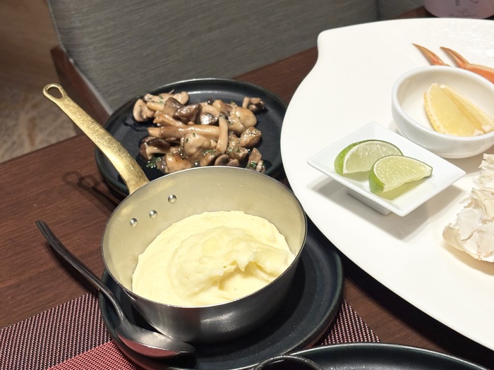 選べるサイドディッシュからは、香ばしいガーリックの香りが食欲をそそる「マッシュルームのガーリックソテー」と「ジャガイモのピューレ トリュフ風味」をチョイス。