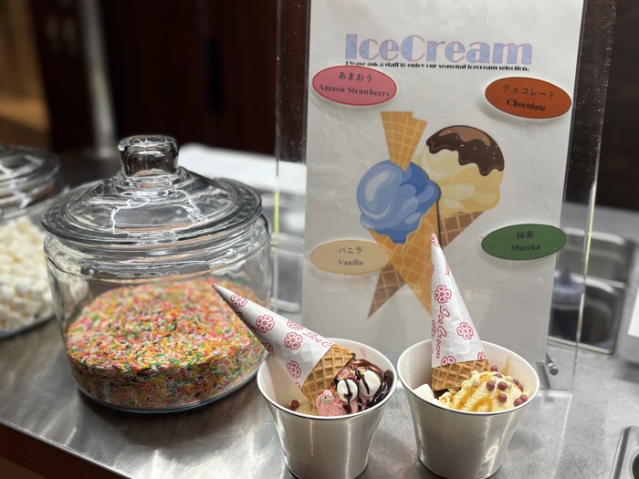 ビュッフェコーナーには、アイスカートも常備!スタッフさんにお好きなアイスクリームをオーダーすると、カップorコーンが選べ、自分好みにトッピングすることができます。
