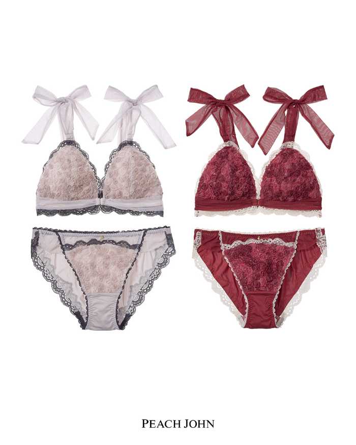 さらに、立体的なローズチュールが華やかな「ローズチュールトライアングルノンワイヤーブラ」は3,600円、BC~DEカップUB65/70/75展開。ショーツは1,800円、S,M,Lで、ピンク、レッドの全2色です。