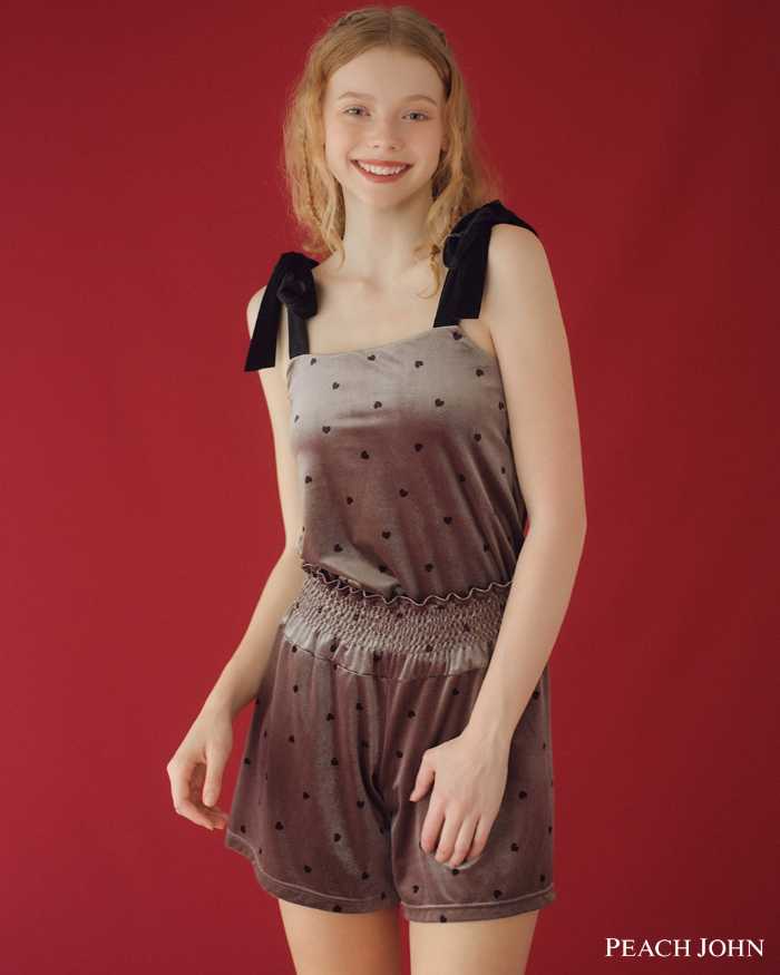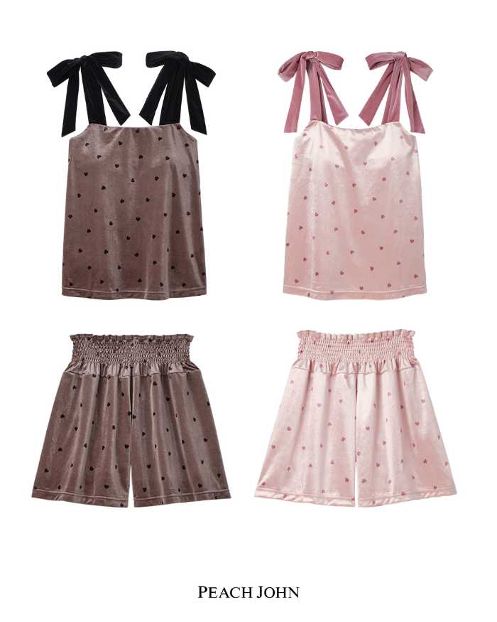 大人かわいいベロア素材の「ハートロマンティックベロアブラキャミソール」は4,200円、サイズはS/M,M/L。セットで着られるタップパンツは3,300円、同サイズ展開で、カラーはグレージュ、ピンクです。