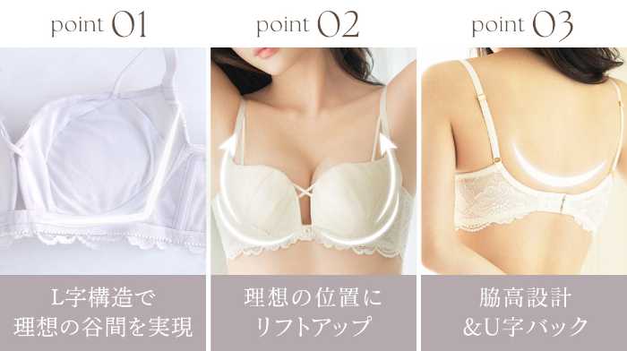 キープゴムが理想の位置へリフトアップし、自然で美しい谷間を長時間キープ。さらに脇高設計&U字バックにより、脇や背中のラインをすっきり整え、後ろ姿まで美しく見せてくれます。