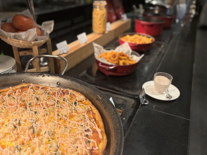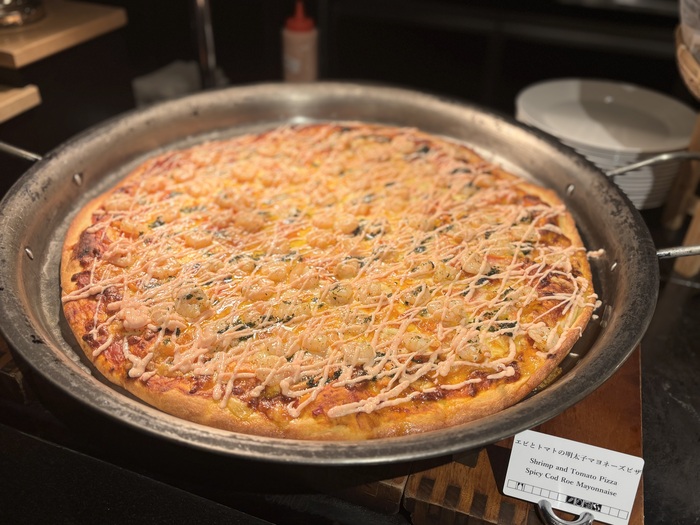 みんなの大好きな食材をぎゅっと詰め込んだピザは、スタッフの方から切り立てを提供いただけます。噛むとふっくらとろけるチーズと、エビと明太子の旨み。