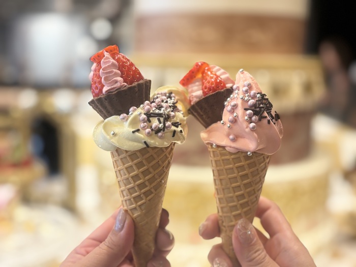 冷んやりスイーツには、ソフトクリームをご用意。バニラ・ストロベリーをチョイスして、お気に入りのスイーツとデコレーション。自分オリジナルの、華やかなソフトクリームの出来上がり。