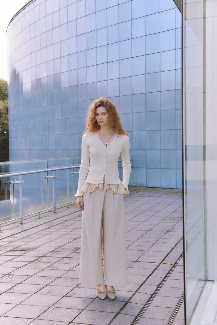 KNIT13,200円とPANTS13,200円のセットは、日常に寄り添いながらも洗練された印象に導きます。どのルックも、春の空気を自然体で楽しめるのが魅力です。