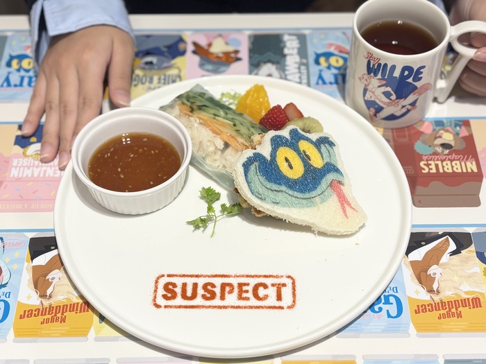 指名手配犯のヘビのゲイリーをイメージした生春巻きのプレート。ゲイリーのお顔つきのパンの下には、すり身とエビのフィッシュバーグが隠れています。シャキシャキのお野菜と春雨、青紫蘇が隠し味になっており、爽やかな味わい。