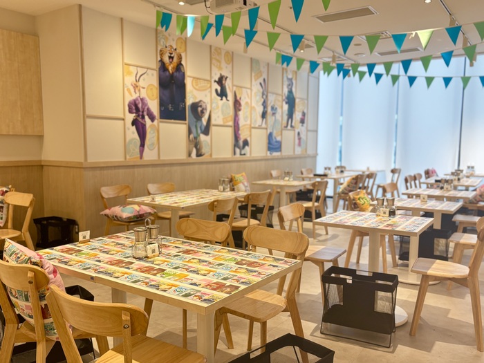 広々としたOH MY CAFEの店内や、内装も『ズートピア2』の世界観一色!モニターでは、オリジナルムービーと、シャキーラが歌う劇中歌「Zoo」が流れており、お食事の気持ちもテンションがあがります。
