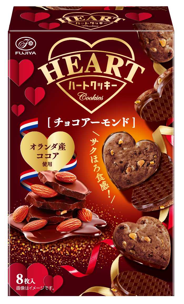 新登場の「ハートクッキー(チョコアーモンド)」は、ほろほろとほどけるチョコアーモンドクッキーにチョコレートを組み合わせた、味も形も楽しめるハート型クッキー。