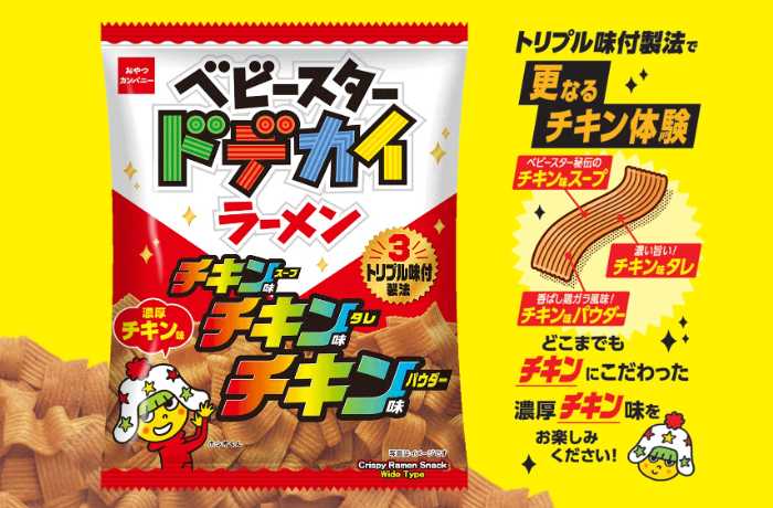 ベビースタードデカイラーメン(チキンチキンチキン濃厚チキン味)は、スープ・タレ・パウダーすべてにチキンの旨みを重ねた特別仕様。