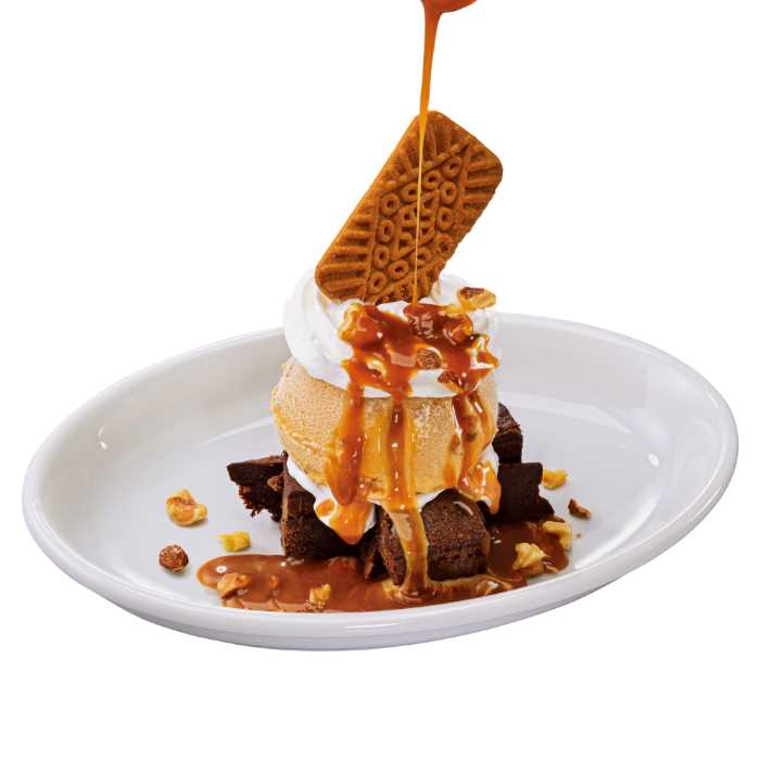 「ブラウニー塩キャラメルファッジサンデー」は、ほんのり温かいブラウニーに、塩キャラメルアイス、ホイップ、ナッツを重ねた満足感のある一品。