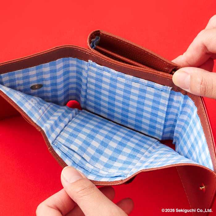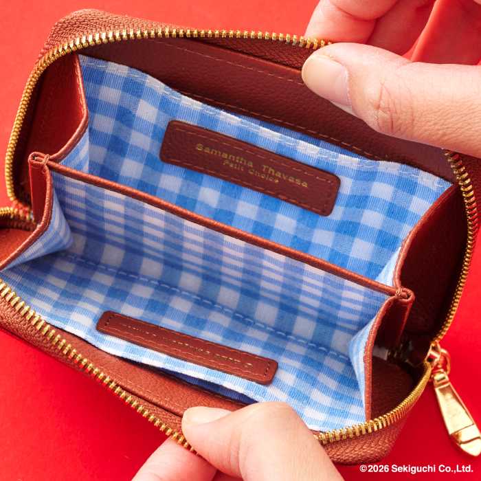 小物は「マルチケース」18,700円、「折財布」22,000円を展開。フロントにはオリジナルのリボンとスタイを付けた「モンチッチちゃん」の金具を使用し、裏地にはギンガムチェックをデザイン。