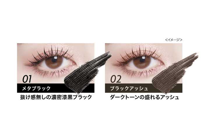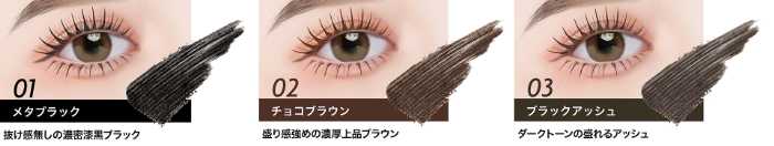 カラーはメタブラック、02チョコブラウン、03ブラックアッシュの全3色展開。シーンやメイクに合わせて選べるのが魅力です。ボリュームとカールを重視したい方におすすめの一本です。
