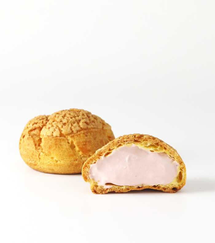 あさぎりいちごミルクシューは450円(税込)、消費期限2日【要冷蔵】。8階催事と1階常設店で販売され、クッキーシューに苺ジャム入りミルククリームをたっぷり詰め込みました。