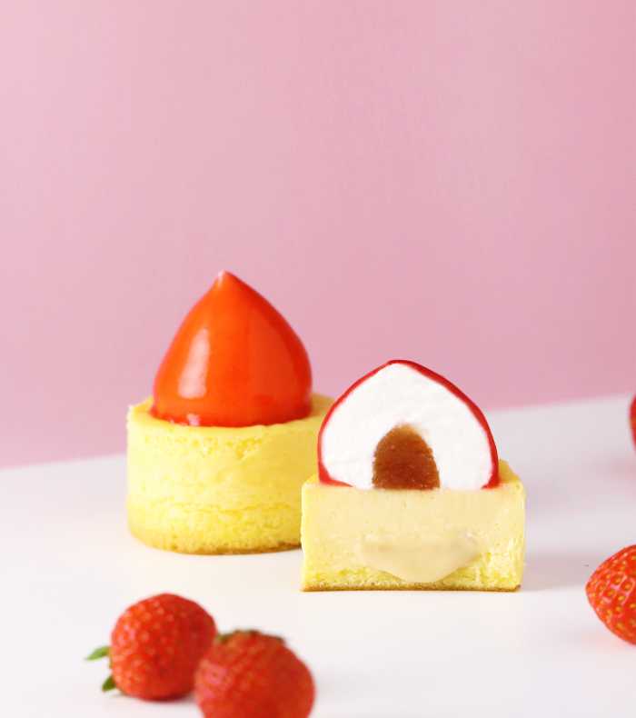 生とろりミルクチーズケーキ〈いちご〉は648円(税込)、消費期限2日【要冷蔵】。8階催事と1階常設店で展開され、苺の見た目も愛らしい季節限定スイーツです。