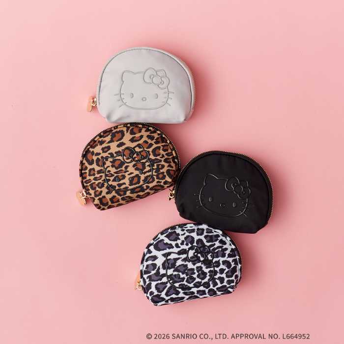 【ハローキティ】立体フェイスプリントシェルポーチは3,479円。モノトーンやレオパード柄で、グレーレオパード(#812)はECサイトと一部店舗限定カラー。