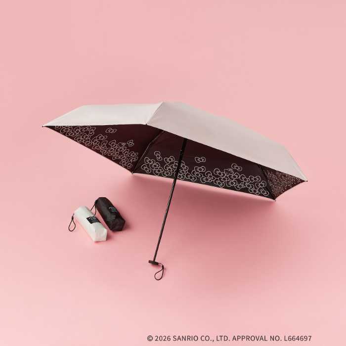 【ハローキティ】晴雨兼用折りたたみ傘は4,979円。オフホワイト、ブラック、ベージュの3色展開。※傘の内側部分は遮光性99%のブラック。