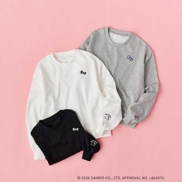 【ハローキティ】ワンポイント刺しゅう入り裏毛プルオーバーは4,979円。刺しゅうカラーはオフホワイト(#003)、ライトグレー(#012)、ブラック(#019)。