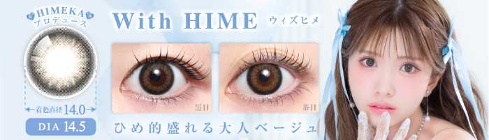 WithHIMEも同じくDIA14.5mm、着色直径14.0mmで、細フチデザインが目元を引き締め、上品なベージュカラーが瞳の色をより明るく強調します。なりたい印象に合わせて選べる2色展開です。