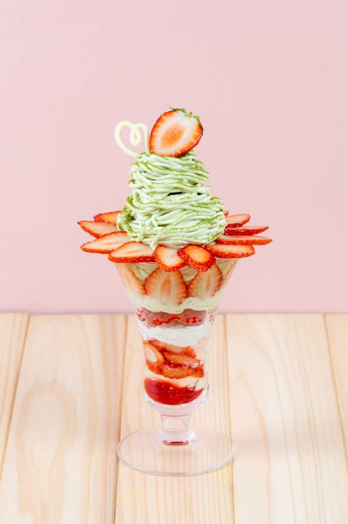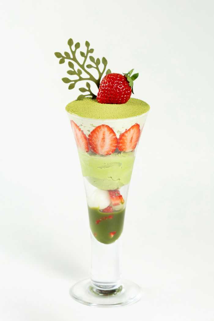 抹茶の香りやほろ苦さに負けないいちごを厳選し、素材同士の相性を大切に仕上げたフルーツピークスのパフェ。