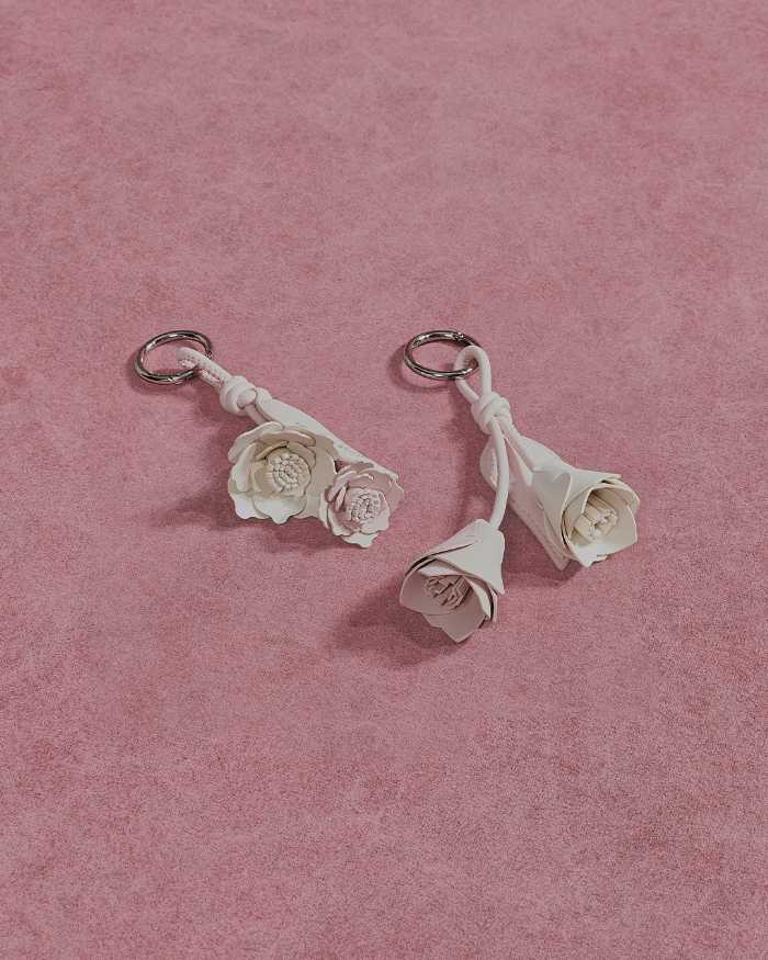 さらに、ローズとチューリップをモチーフにしたバッグチャーム2種が、さりげない遊び心を添えます。