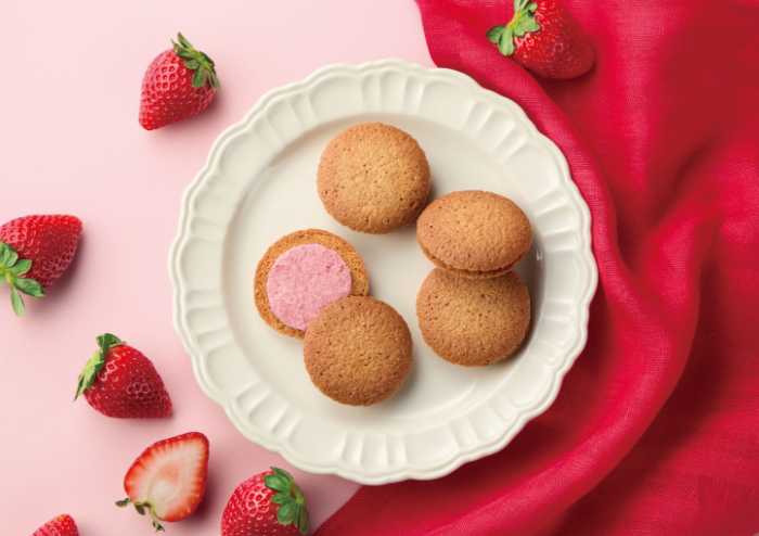 新商品「苺のクッキーサンド」は、全粒粉の香ばしさとサクサク食感が楽しめるクッキーに、苺のクリームをサンドした一品。