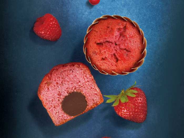 ラズベリー、クランベリー、ストロベリーを使った生地に、トリュフチョコレートを一粒閉じ込めました。