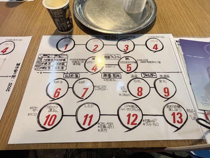 分類シートが手元に用意され、8種類に分類された日本酒と異なる3種のお酒をラベルの見方と、わかりやすい解説と共にテイスティング。