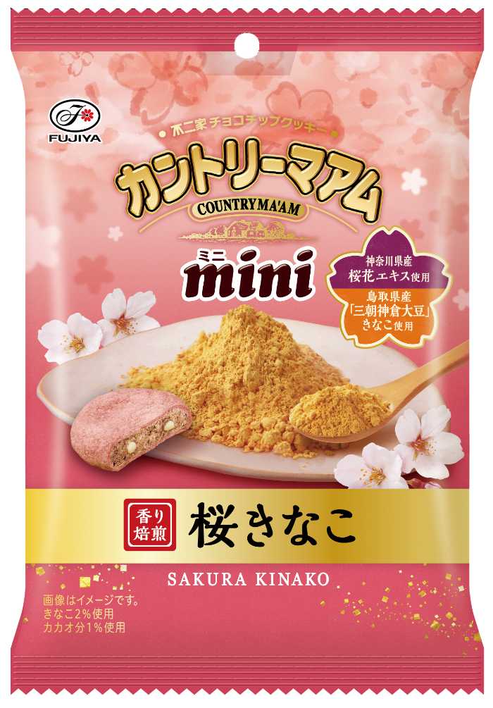 「カントリーマアム(桜きなこ)」は、神奈川県産桜花エキスと鳥取県産「三朝神倉大豆」のきなこを生地に練り込み、ホワイトチョコチップを合わせた春らしいフレーバー。