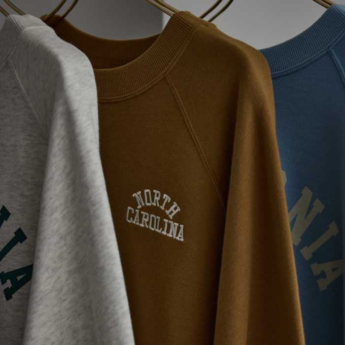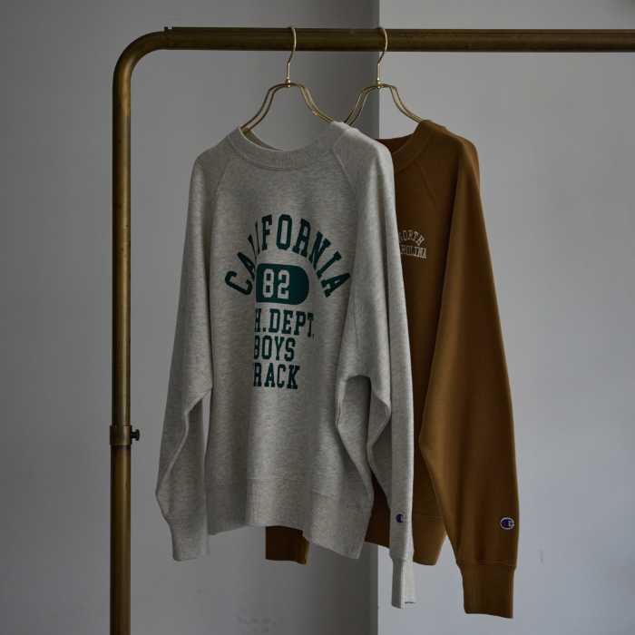 スウェットは、ヴィンテージライクなカレッジ風プリントと、着回ししやすいワンポイント刺繍のアソート展開。コーディネイトの主役にも、さりげないアクセントにもなる万能さが魅力です。
