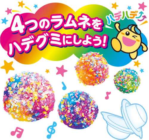 「ふってつくろう!ハデグミ!」は、ラムネとグミのもとの粉に水を加え、容器を振るだけで作れる手軽さが魅力。振るたびにグミがラムネにくっつき、ころんと丸く大きく変化します。