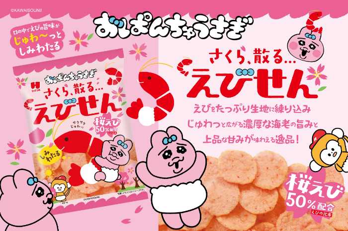 「おぱんちゅうさぎしみわたるえびせん」は、桜の季節とピンクをテーマにした春らしい一品。
