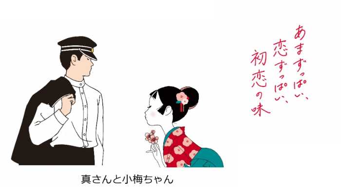小梅グミは、小梅ちゃんが慕う真(まこと)さんとの淡い恋の行方を予感させる「春一番」をイメージした梅味グミ。