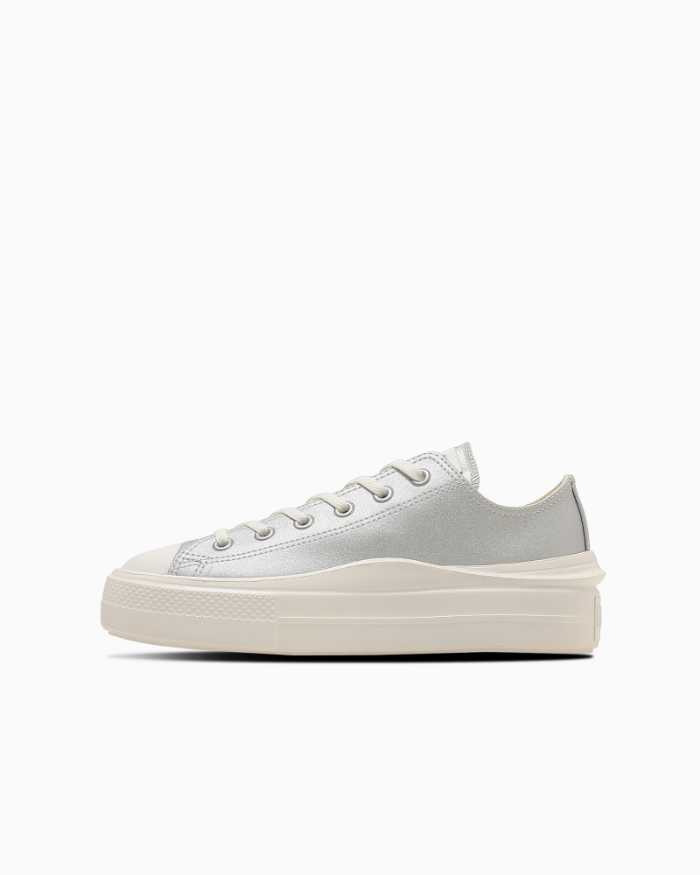 厚底ソールとウェーブデザイン、アッパーはシャイニーなメタリック素材。タンラベルやシューレースにグリッターを取り入れ、足元にさりげないアクセントを演出。