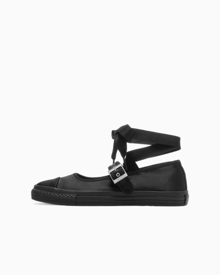 バレエコアを取り入れた薄底モデル。サテン素材とリボンテープで上品に仕上げ、取り外してシンプルなメリージェーンとしても履ける設計。