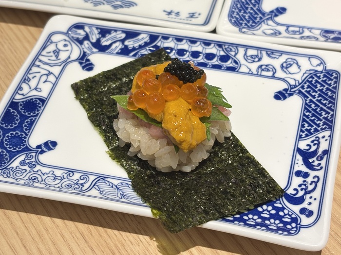 磯の風味豊かな海苔で包む、中とろと旨み濃厚ないくらに、ランプフィッシュキャビアをトッピングした贅沢なお寿司。(※ランプフィッシュキャビアを使用)