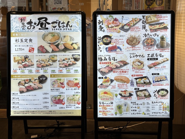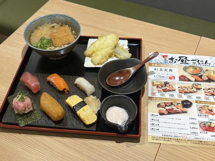 「杉玉定食」は、お寿司・うどん・天ぷらが定食になったお得なメニュー。お寿司は日替わりでおすすめのネタでご用意!自慢のお寿司も天ぷらもうどんもいただける定食、コスパも最強です。
