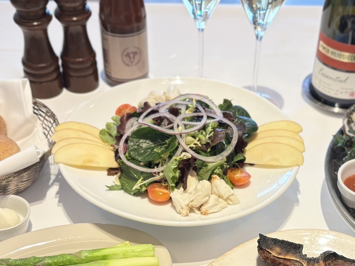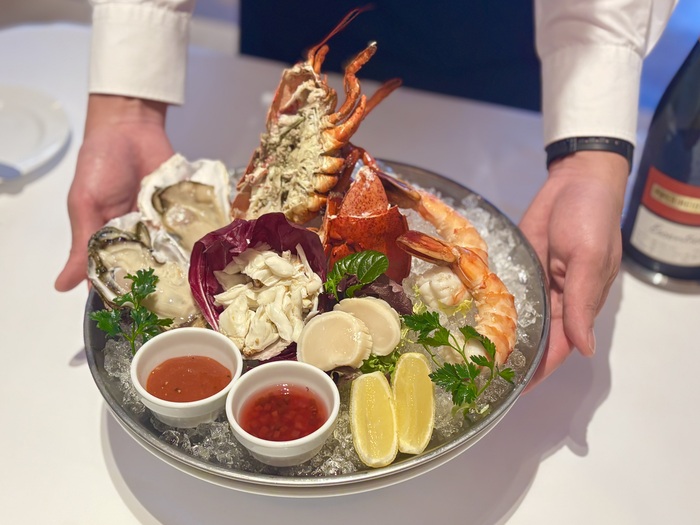 冷たい氷の上には新鮮な魚介類が華やかに盛り付けられており、テーブルに運ばれてきた瞬間から気持ちが躍ります。岩手県産の牡蠣、渡り蟹のほぐし身、帆立の貝柱、シュリンプカクテル、ロブスターカクテル、シャンパンと一緒に乾杯♪