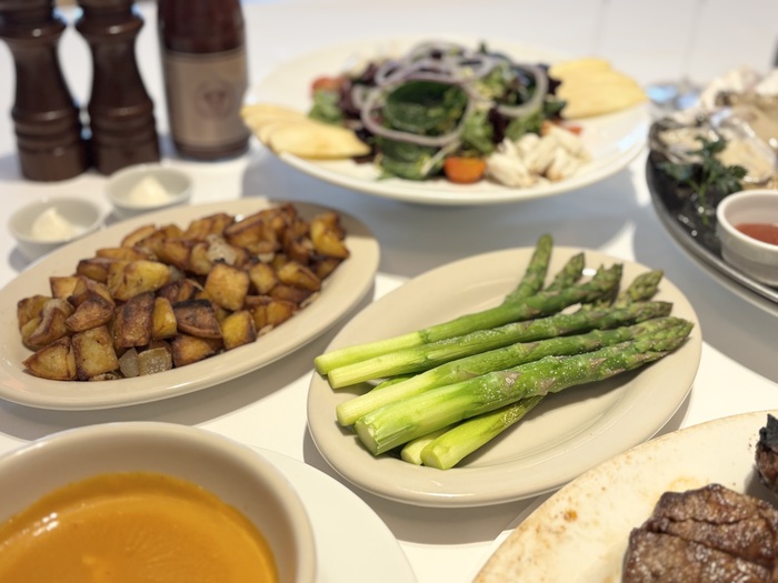 豪華なステーキとテーブルを彩る”サイドディッシュ”サイズ感もアメリカン!シャキっとした歯応えのみずみずしい「グリーンアスパラガス ソテー」と、カリッとクリスピーな食感は食べ出すと止まらない「ベンジャミンホームフライ」。