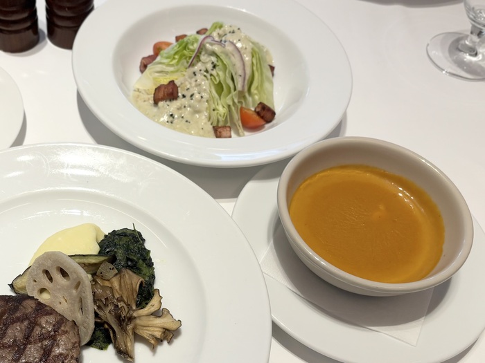 ゴルゴンゾーラチーズの風味が癖になる味わいの「ウェッジサラダ」、ロブスターの旨み濃厚な「ロブスタービスク」。