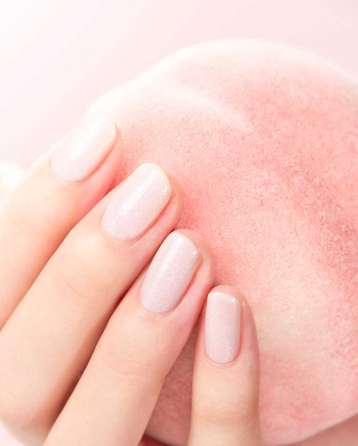 彩度の高い赤みピンクに、ピンクとゴールドの粒ラメをプラス。とろみのあるクリアな液が爪表面をなめらかに整え、血色感と透明感のある指先へ導きます。