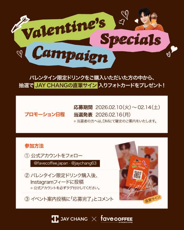ジェイ・チャンとfave COFFEEが届けるのは、ドリンクを超えた“記憶に残る体験”。バレンタイン限定の味わいと、ここでしか手に入らない特典は、ファンにとってかけがえのない宝物になるはずです。