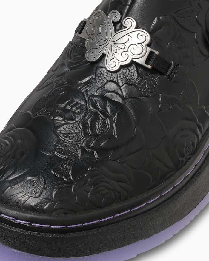 ブラック/パープルのカラーと蝶や薔薇モチーフが春の足元を華やかに演出♡軽量で歩きやすく、オンラインショップや取り扱い店舗で手に入る限定モデルです♪